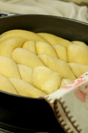 aluatu o strangemca un colacel si o asezam in tava . La fel procedam cu a 2 parte de aluat.Invelim placinta formata si o lasam sa creasca in forma ei. Dupa aceia o ungem foarte atent cu pensula toata suprafata ei si o dam la cuptorul incalzin pana la 180 C-